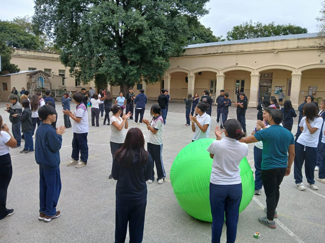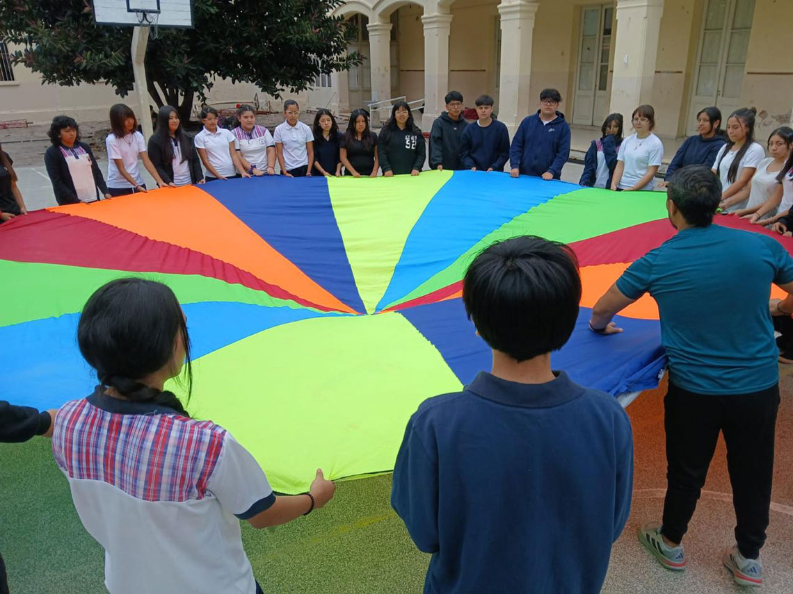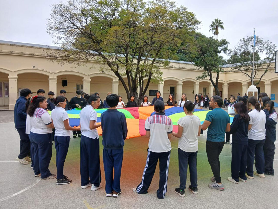 Las actividades iniciaron hoy a las 10 horas en el Colegio N° 5095 “Gral. Manuel Belgrano”, con estudiantes del Nivel Secundario, donde se desarrollaron pausas activas, activación con ritmo y propuestas lúdicas innovadoras como juegos con paracaídas y pelota de Kinball, favoreciendo la participación grupal y el disfrute del movimiento.
