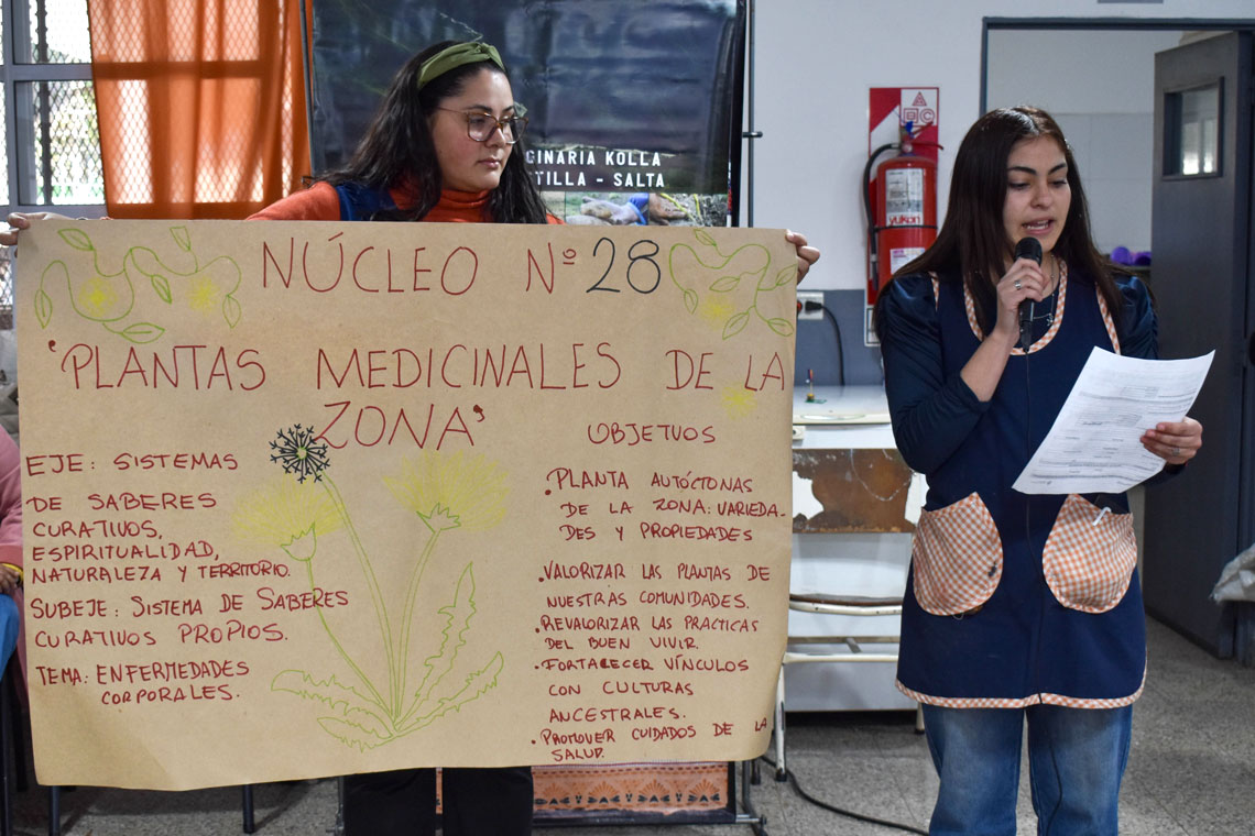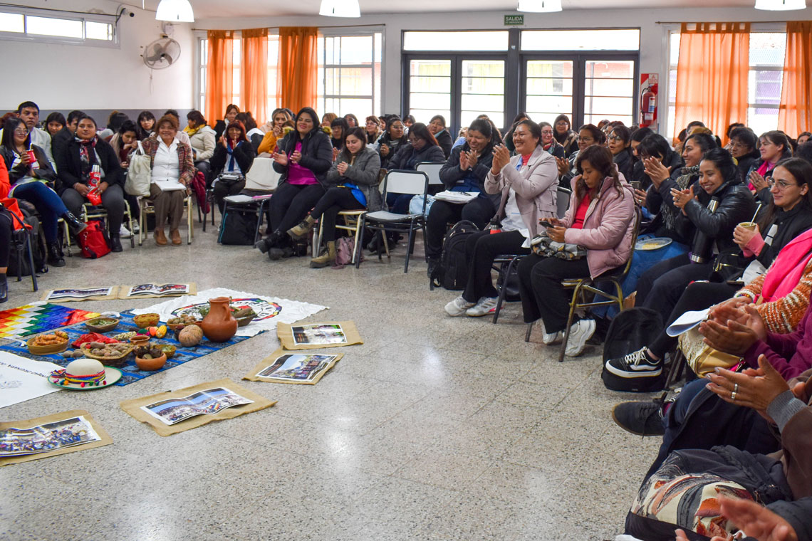 Por la tarde, se propició un espacio de escucha y diálogo con las referentes y autoridades comunitarias de las comunidades indígenas kollas Urkuwasi y Kondorwaira. Inicialmente se comparten concepciones de territorio y procesos de lucha territorial, así como la iniciativa de incorporación, mediante normativa, de la simbología y emblemas propios en diferentes ámbitos comunitarios e institucionales. En el mismo sentido, se dialogó en torno a sistemas de saberes y prácticas de soberanía alimentaria relacionadas al cuidado de las semillas, las variedades de maíz y de papas, y los calendarios agrofestivos en las comunidades. Por último, se habilitó un espacio de preguntas e intercambios entre las referentes comunitarias junto a las y los docentes.