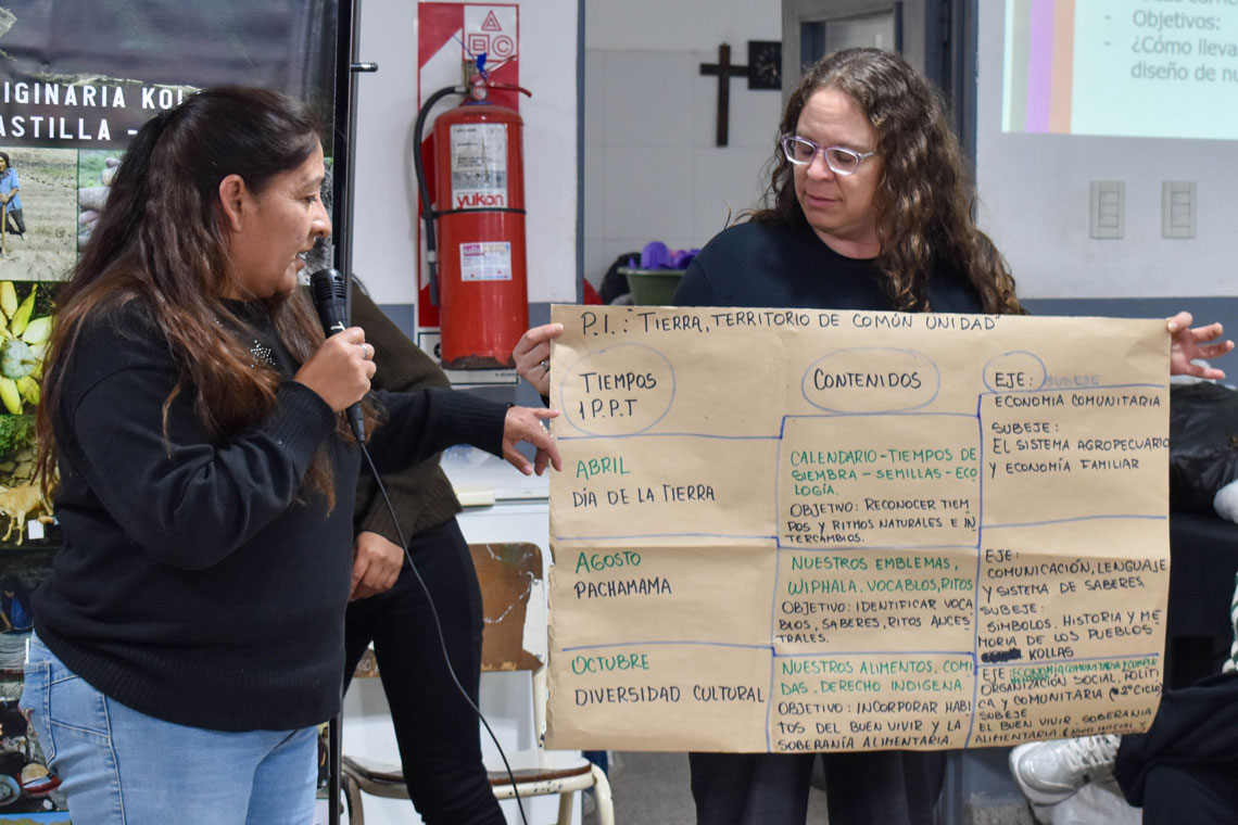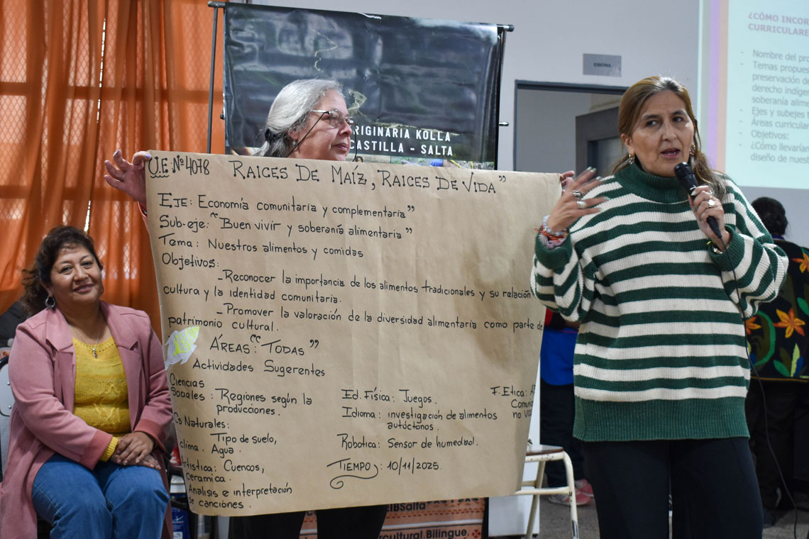 Durante la puesta en común, se hizo hincapié en la diversidad de contextos y comunidades que caracterizan al departamento La Caldera y en consecuencia la importancia de resignificar el currículum a partir del diálogo permanente con las familias en las comunidades. Al respecto, las y los docentes compartieron sus experiencias previas en contextos interculturales y el reconocimiento de algunas referentes en la lucha por la educación intercultural bilingüe en la provincia de Salta.