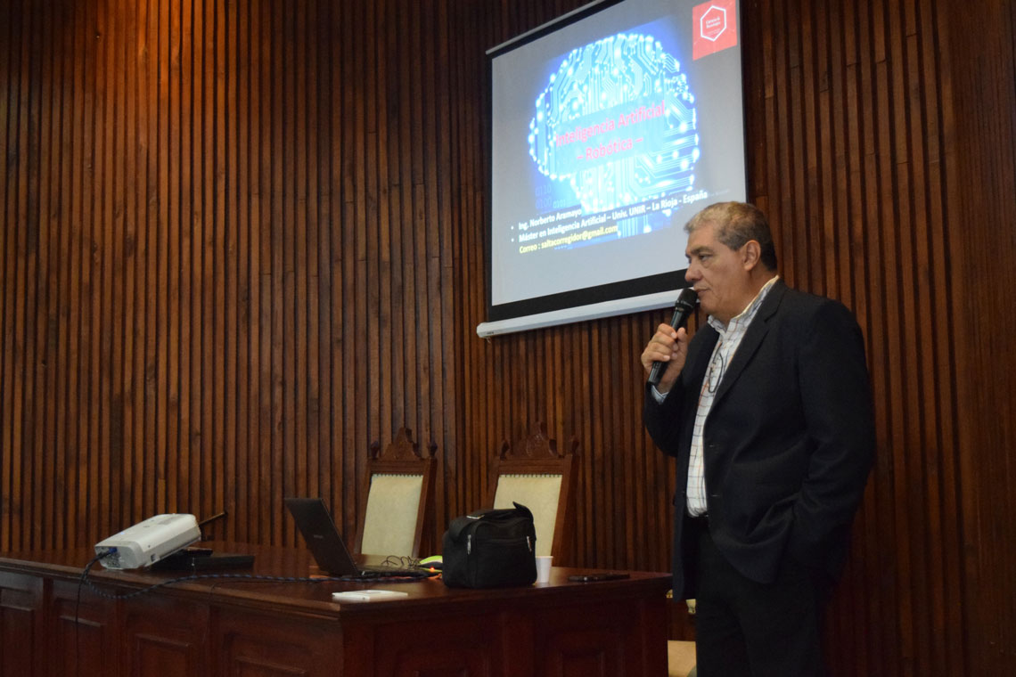 La exposición estuvo a cargo de Norberto Aramayo, quien abordó conceptos básicos sobre inteligencia artificial: qué es la IA, cómo funciona, recomendaciones generales, cuáles son sus principales aplicaciones en diversos ámbitos, su rol fundamental en la sociedad moderna y el impacto que tiene en la vida de las personas.