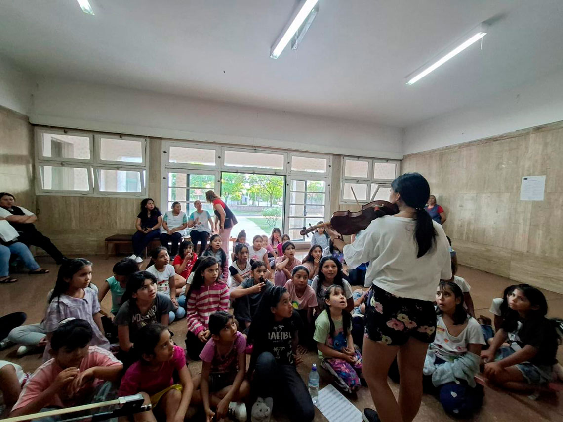La iniciativa alcanzó alrededor de 120 niños, niñas y adolescentes, quienes participaron de clases semanales de coro, lenguaje musical y percusión. Asimismo, los estudiantes tuvieron la oportunidad de presenciar demostraciones de instrumentos de cuerda, violín, viola y violonchelo, ampliando su universo sonoro y acercándose a nuevas experiencias musicales. En este marco se destaca el compromiso de los docentes Alejandra Medina (percusión) y William Coronado (coro y lenguaje musical), que junto a la expresividad de los niños en sus voces, reflejan el profundo significado que la música adquiere en sus vidas cotidianas.