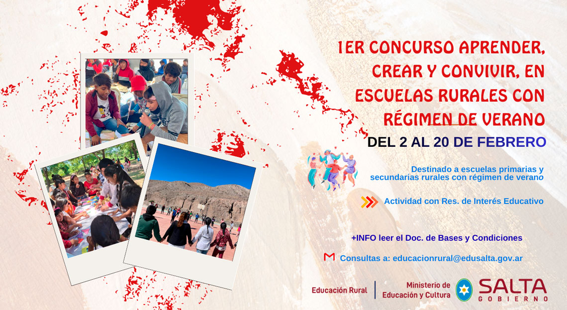 La Coordinación de Educación Rural convoca a instituciones rurales de los niveles Primario y Secundario con régimen de verano a participar del 1° Concurso “Aprender, Crear y Convivir”, una propuesta orientada a fomentar la participación estudiantil y la producción cultural en contextos educativos rurales durante el período estival.
